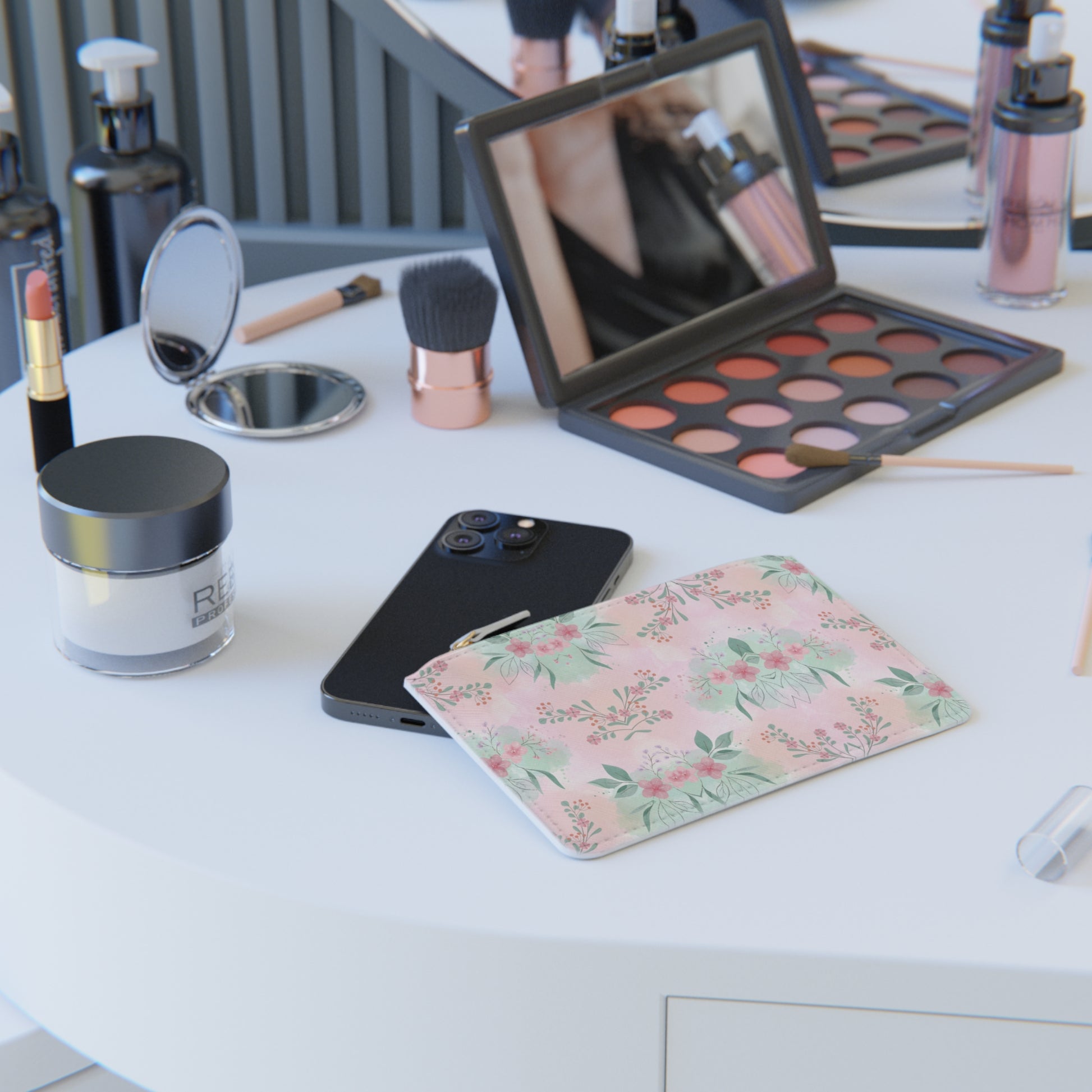 A delicate mini clutch that carries a soft, floral daydream wherever you go. Lightweight and structured with a subtle Saffiano texture, the faux-leather exterior shows a watercolor-inspired bouquet in blush pinks and mint greens. Gold-toned zipper hardware adds a warm, vintage touch while the compact interior and built-in pocket hold cards, keys, and small essentials without bulk. Durable printing keeps the colors lively; black lining keeps the interior neat. Thoughtfully assembled in the USA from global parts, this clutch blends practical organization with gentle, romantic style.