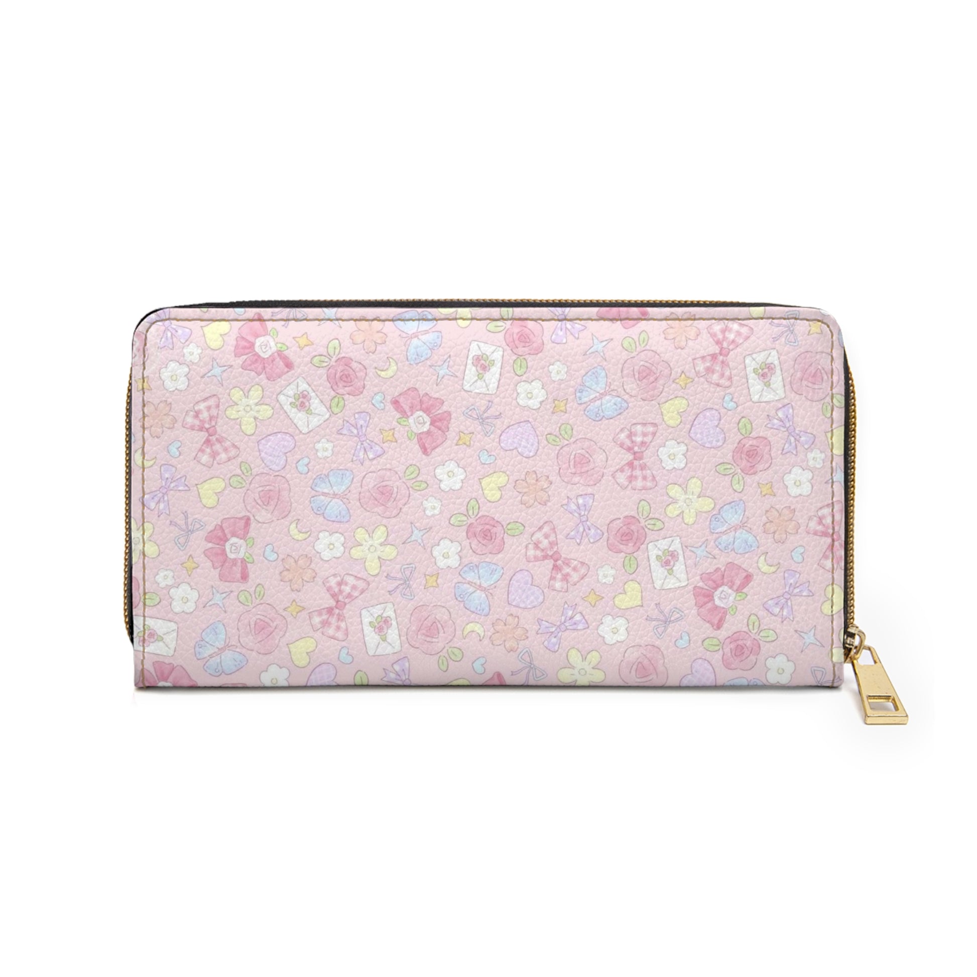 Soft, pastel charm meets everyday organization. This zipper wallet carries a gentle pattern of tiny florals and playful icons across a shimmery pale-pink surface, bringing a light, whimsical touch to your daily routine. Slim but roomy, it opens to reveal neatly arranged pockets for cash, cards, coins, and a checkbook — everything stays secure behind a smooth nylon zipper and polished alloy pull. The PU leather exterior shows off bright, crisp printing and gold-color thread stitching that catches the light and elevates simple errands into small, stylish moments.