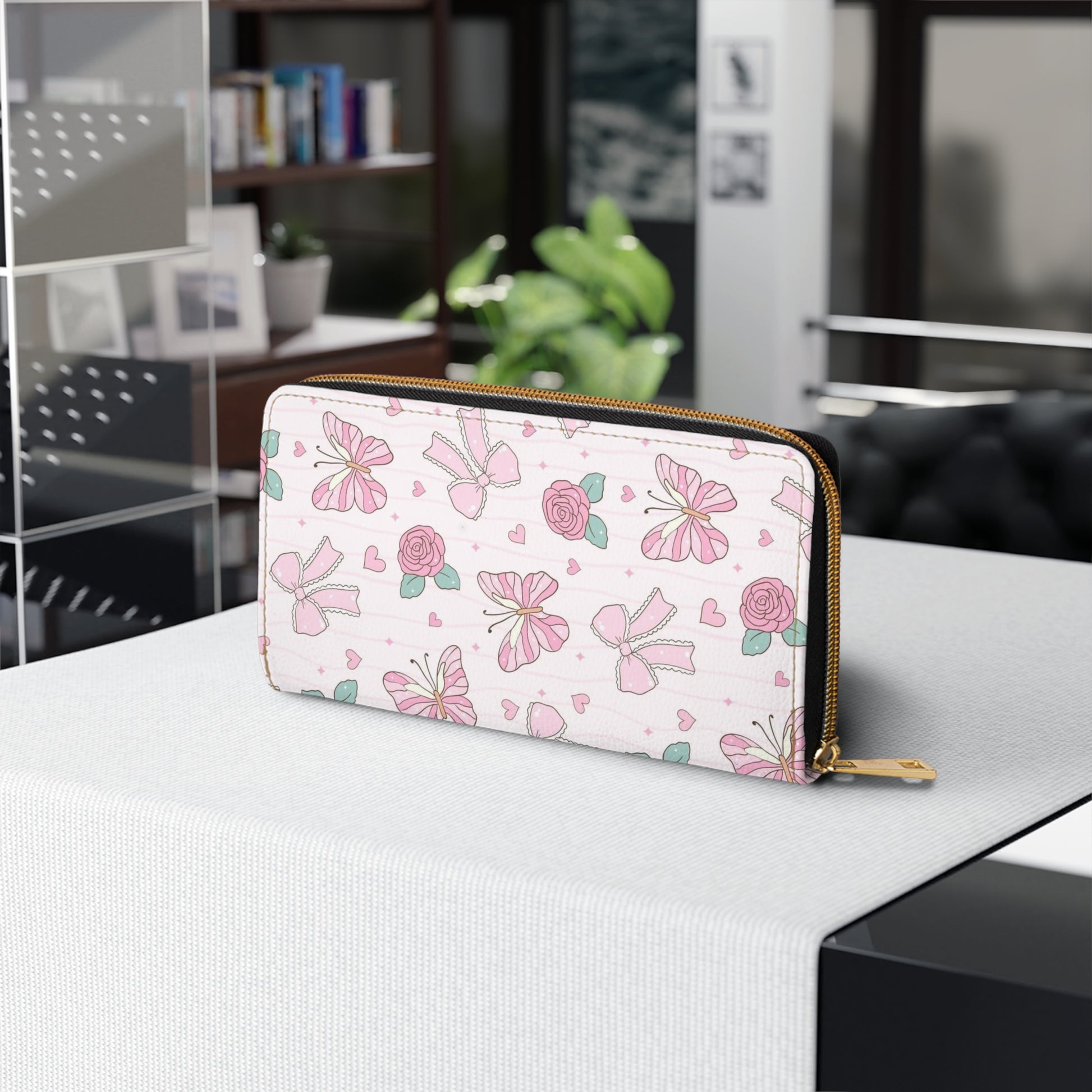 Floral Pink Bow Zipper Wallet — Cute Rose & Ribbon Travel Wallet