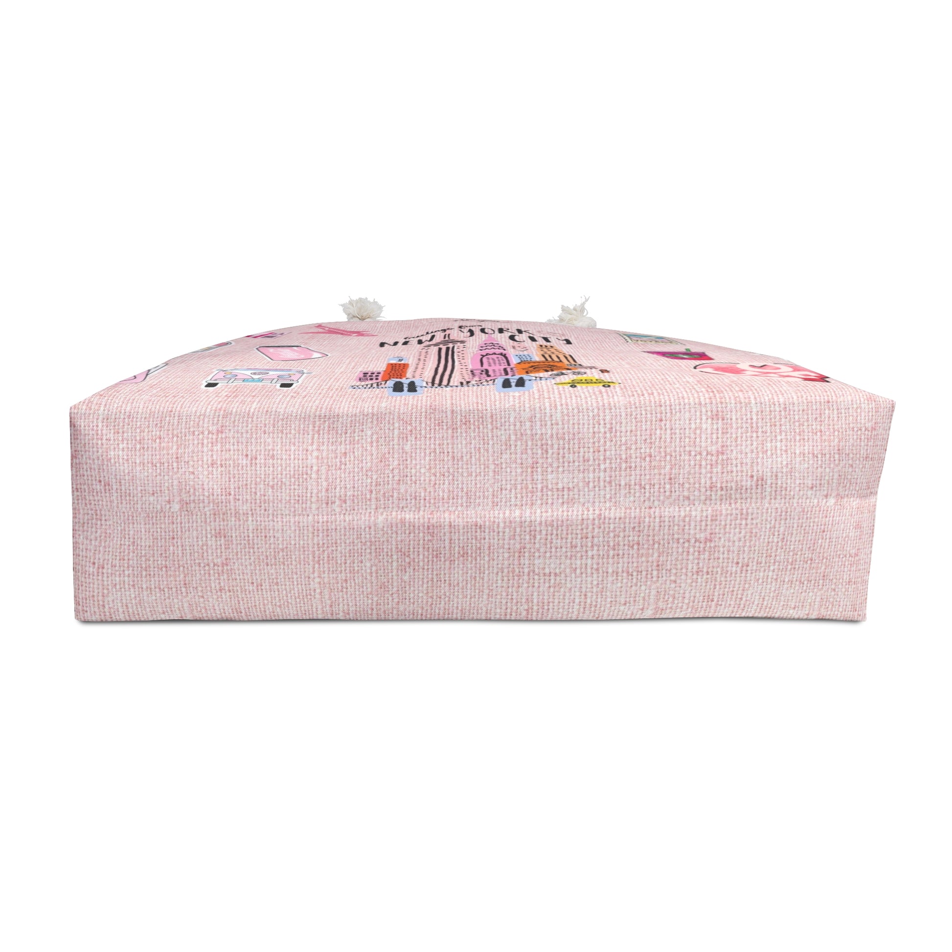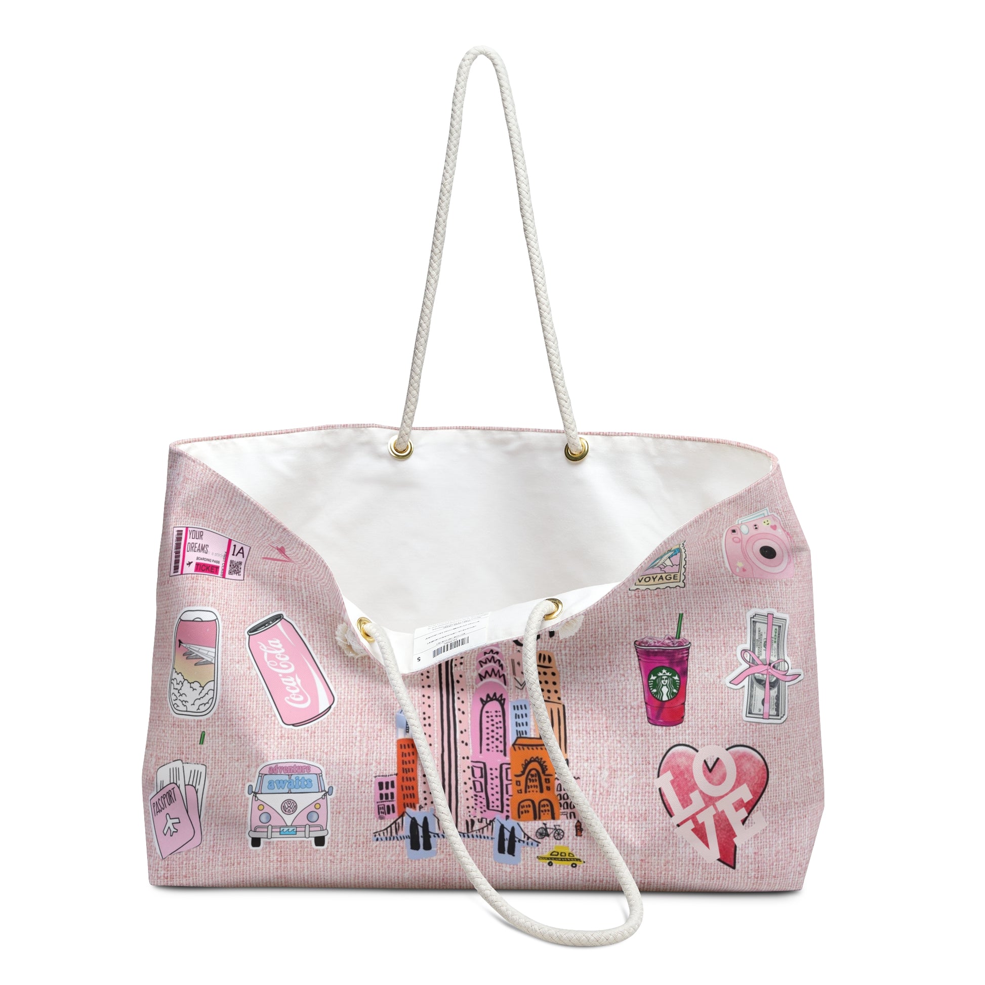 A soft, roomy weekender bag that carries the easy, sunlit energy of a city escape. The pale blush exterior is printed with whimsical New York–inspired pins and skyline sketches, while cream rope handles and gold grommets add a light, nautical touch. It opens to a cream-sheeting lined interior with a structured T-bottom that keeps essentials organized and upright. Lightweight yet durable spun polyester resists wrinkles, so it looks put-together straight out of the car or off the plane. Bring it to weekend getaways, city strolls, or relaxed beach days — it holds outfits, souvenirs, and plans without fuss, and ages into a familiar travel companion.