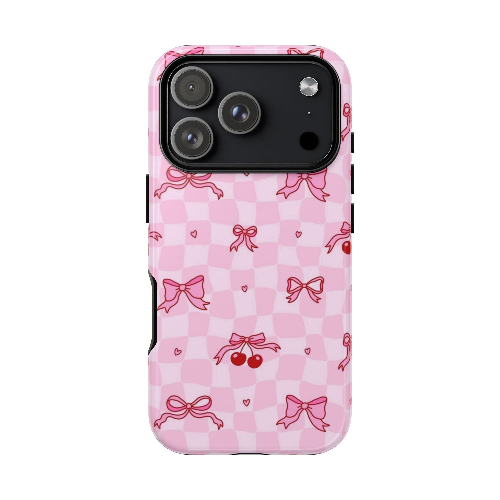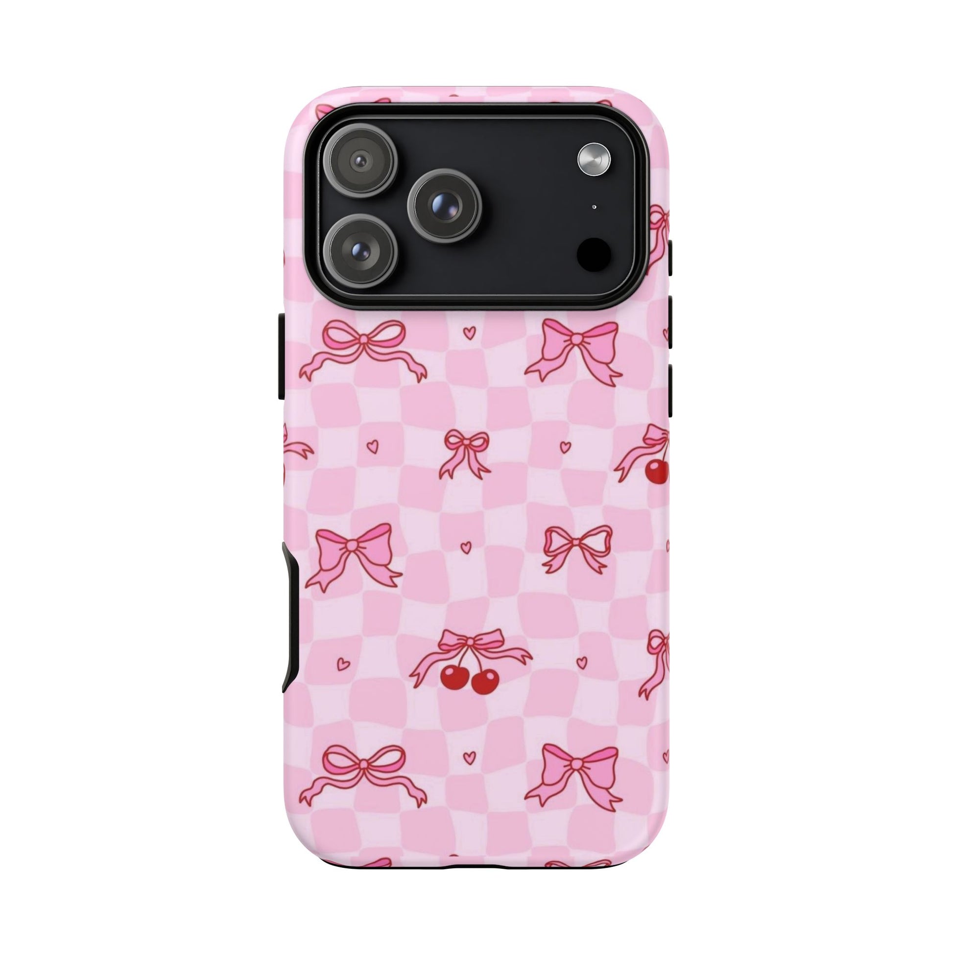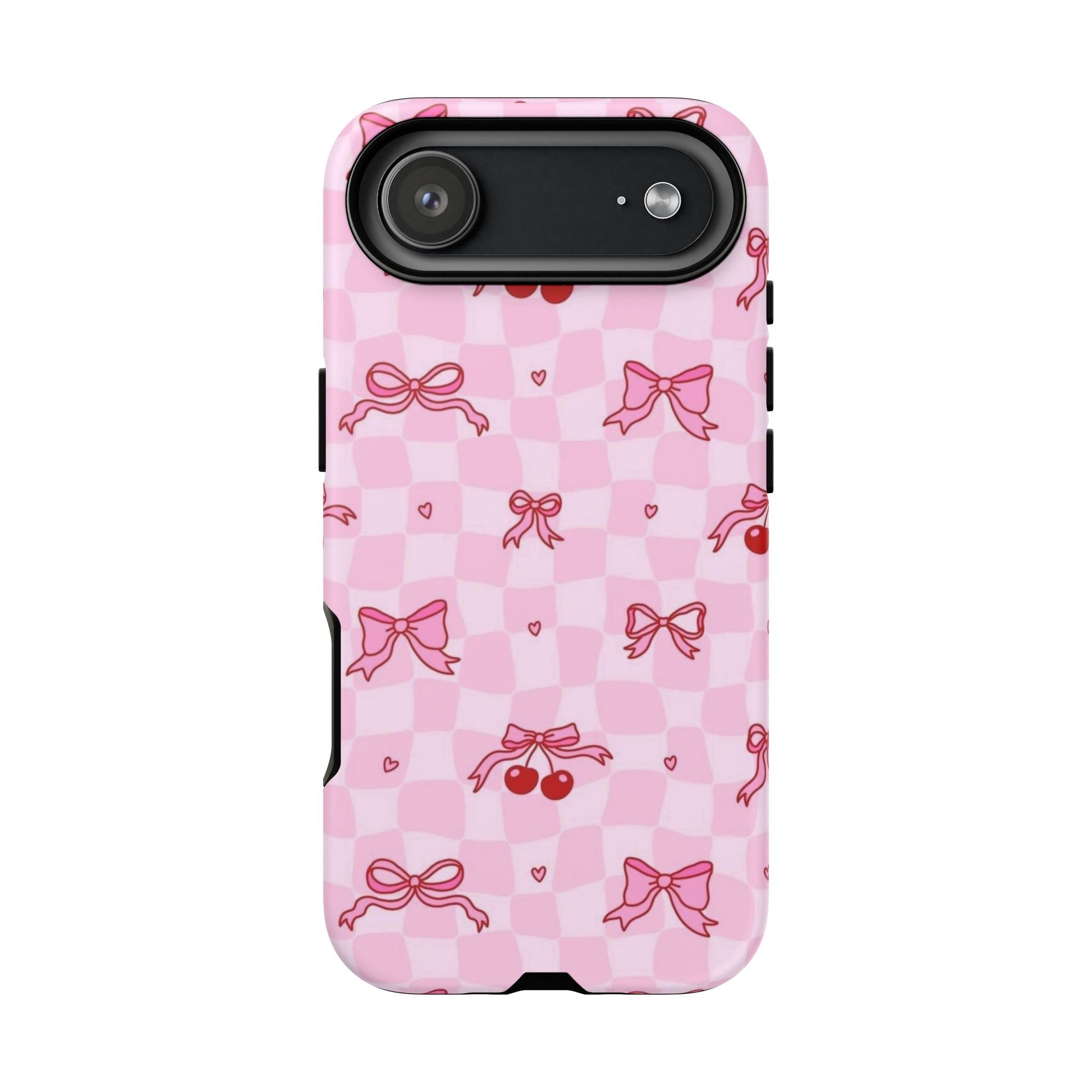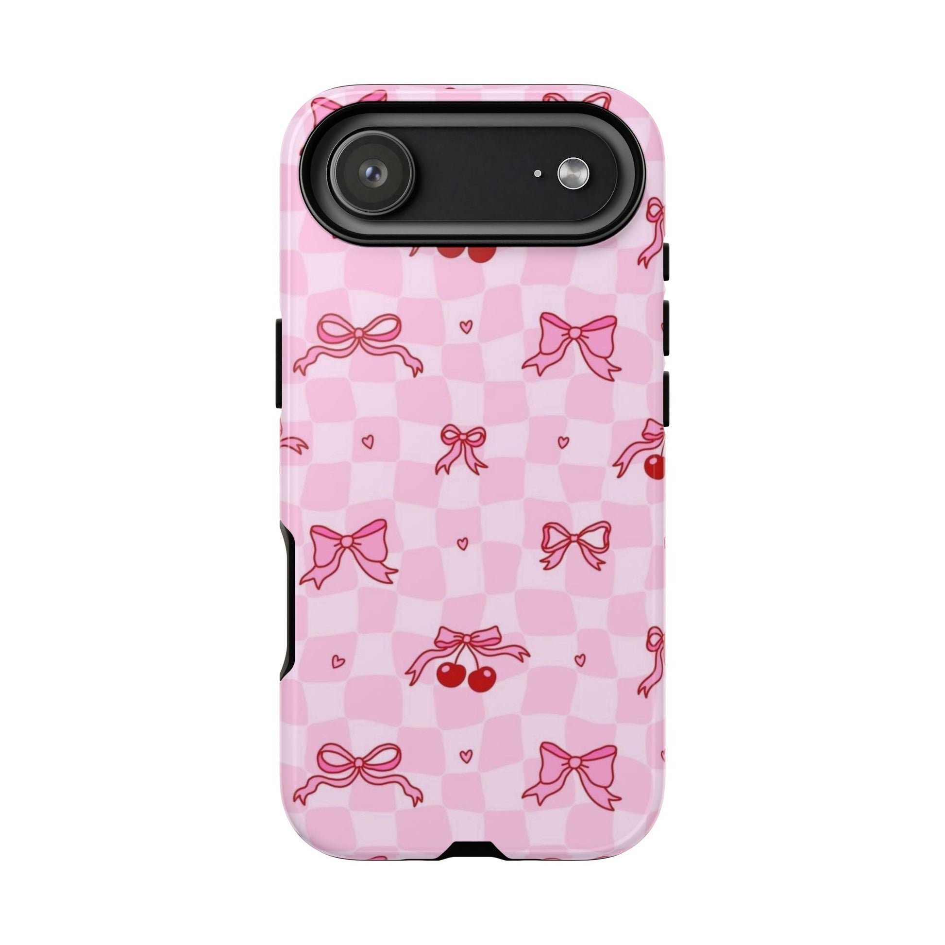 Pink Cherry Bow Phone Case — Cute Checkerboard iPhone Protection