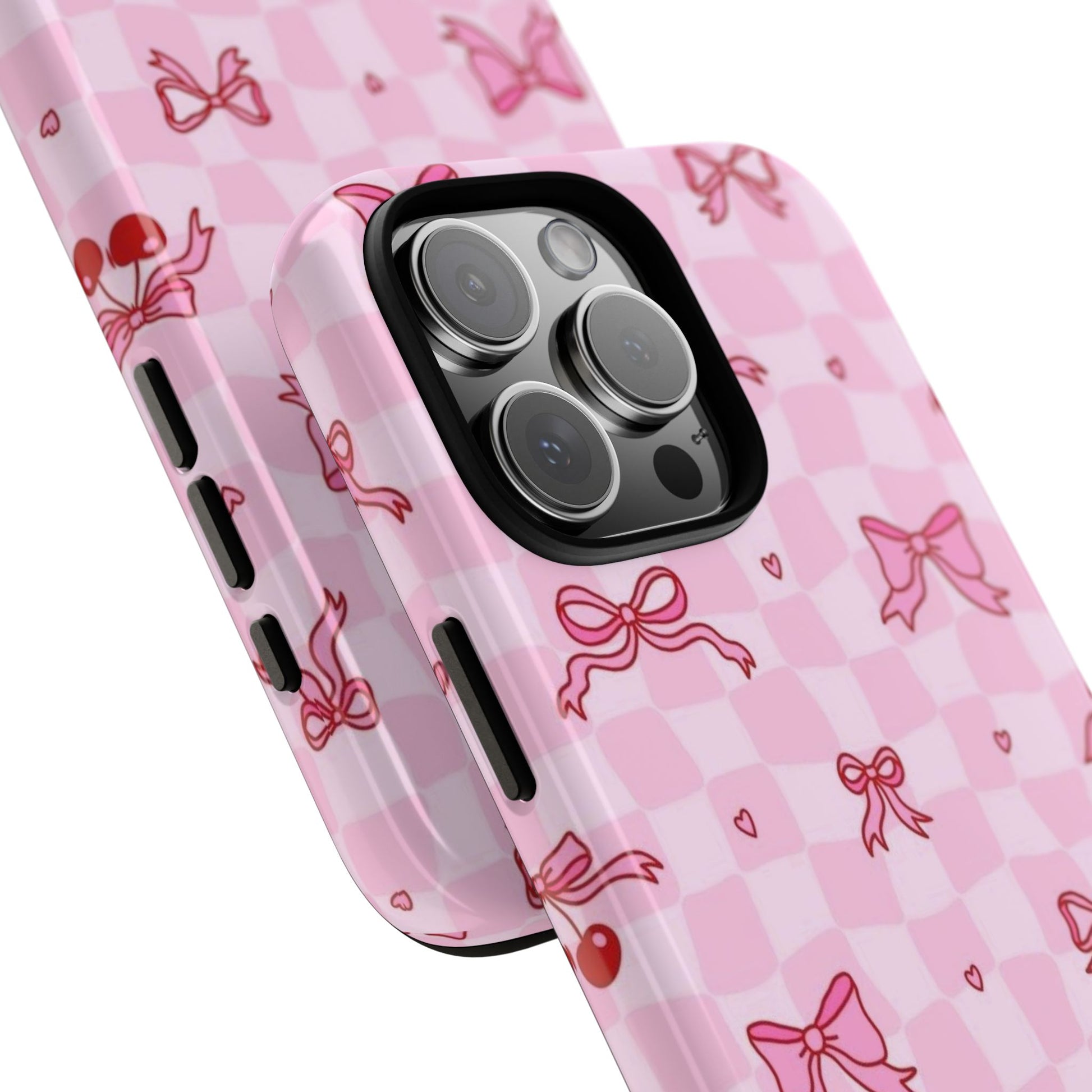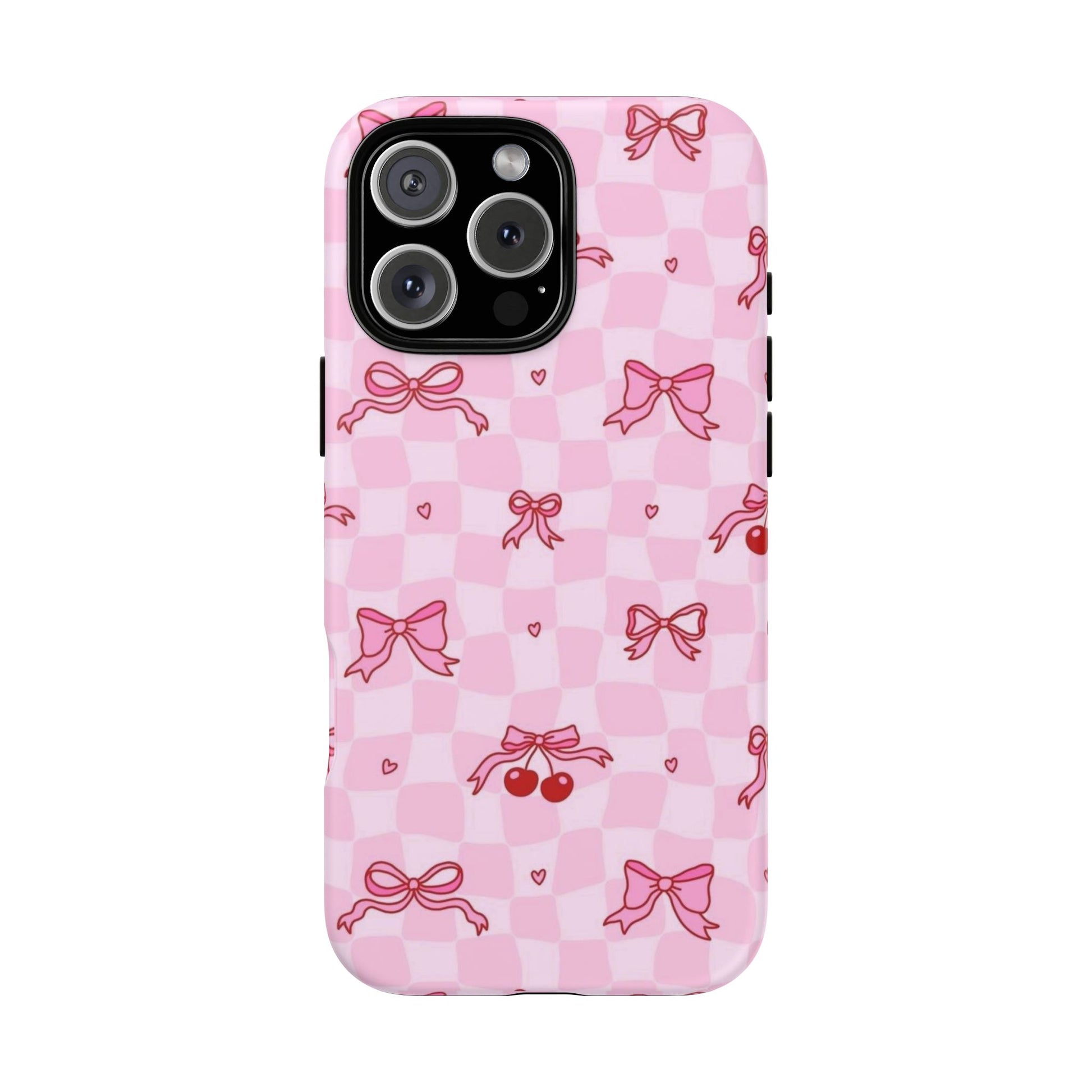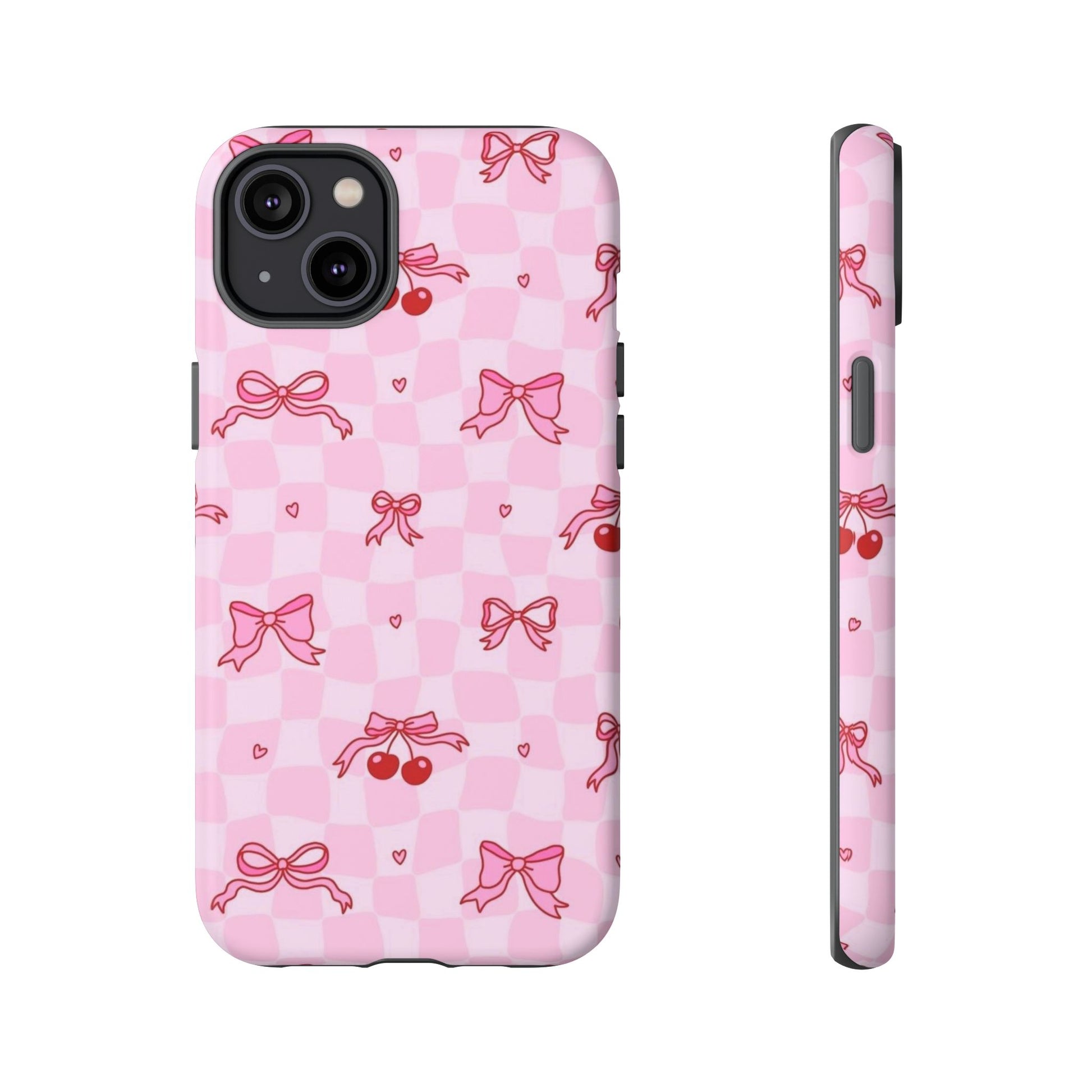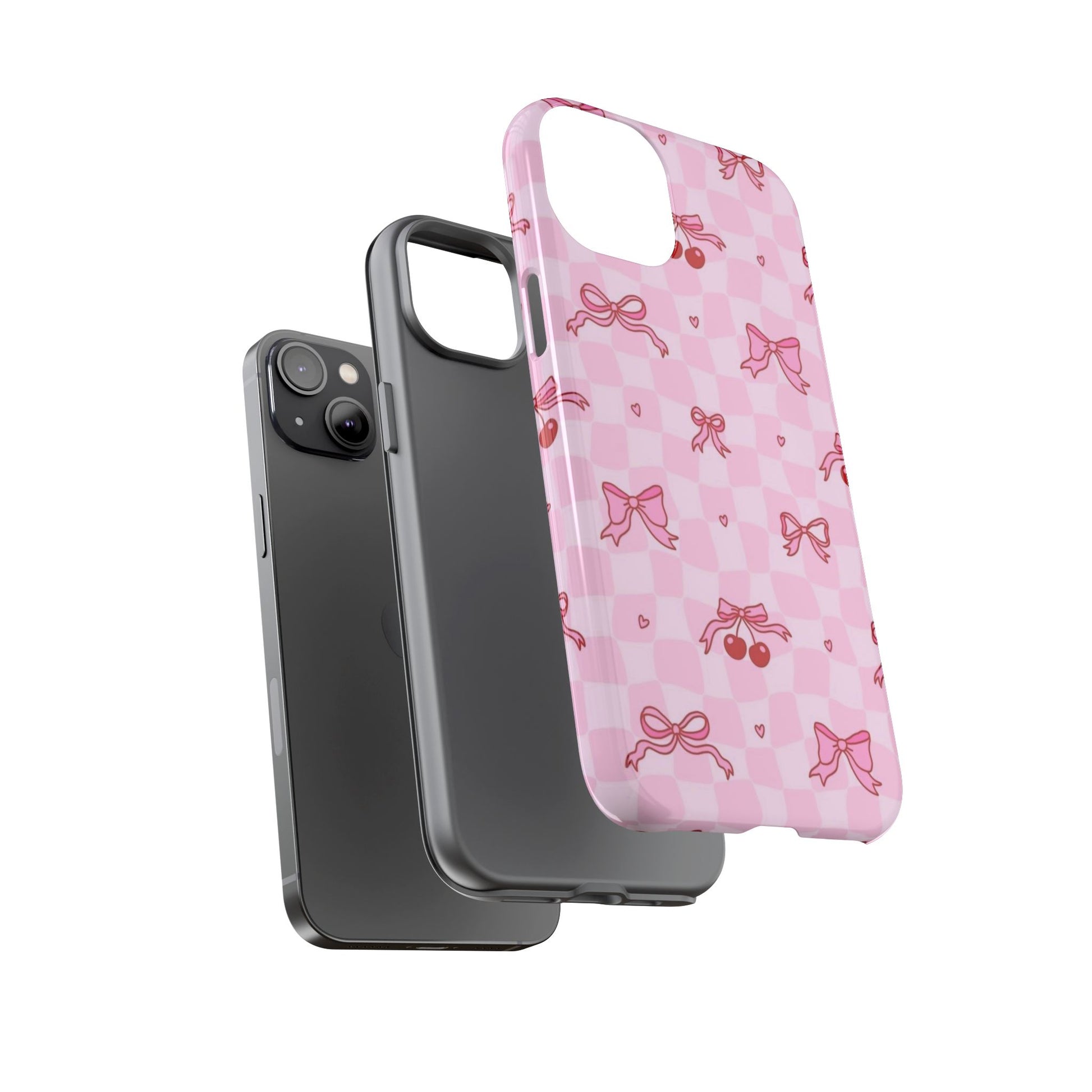 Pink Cherry Bow Phone Case — Cute Checkerboard iPhone Protection